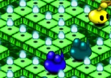 Peligroso hombre bomba. Debes colocar las bombas por toda la pantalla e intentar que no quede ninguna caja, pero ten cuidado con sus guardianes que pueden dejarte fuera de combate.
